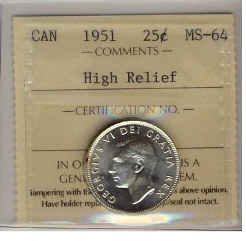 1951 25¢ High Relief ICCS MS64