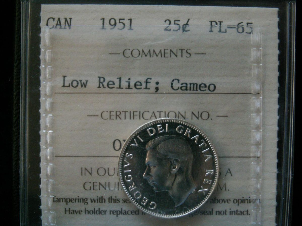 1951 25¢ Low Relief ICCS PL65 Cameo.