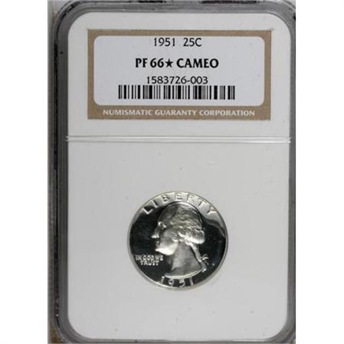 <B>1951 25C PR66</B></I> S<B> Cameo NGC.</B></I> NGC Census: (60/108). PCGS Population (43/39). Numismedia Wsl. Price for NGC/PCGS coin in PR66: $320. (#85983)<BR><BR><b>Shipping:</b> Coins & Currency (<a target="_blank" href="http://www.heritageauctions.com/common/shipping.php">view shipping information</a>)