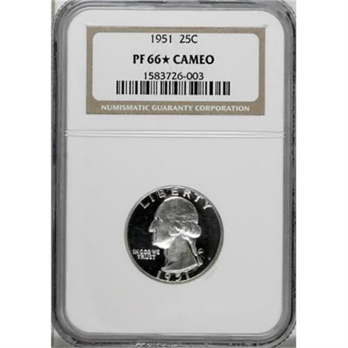 <B>1951 25C PR66 Cameo </B></I><img src="/images/star.gif" width="10" height="10" alt="" border="0"><B> NGC.</B></I> NGC Census: (60/110). PCGS Population (46/39). Numismedia Wsl. Price for NGC/PCGS coin in PR66: $300. (#85983)<BR><BR><b>Shipping:</b> Coins & Currency (<a target="_blank" href="http://www.heritageauctions.com/common/shipping.php">view shipping information</a>)