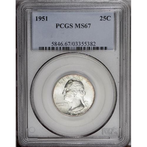 <B>1951<25C> MS67 PCGS.</B></I> Razor-sharp striking definition with vibrant, full luster and lovely golden-brown peripheral toning. A beautiful Superb Gem that is nearly devoid of contact. Population: 34 in 67, 0 finer (1/06).<BR><I>From The Houston Collection of Washington Quarters.</B></I>