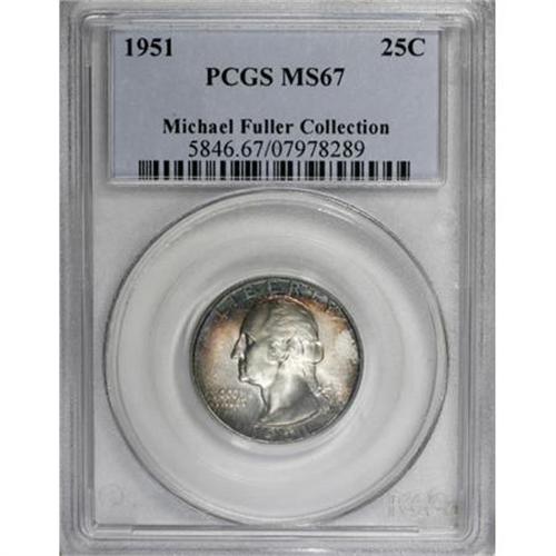 <B>1951 25C MS67 PCGS.</B></I> Lovely shades of reddish-plum, golden-brown, and electric-blue grace the peripheral zones of this highly lustrous Superb Gem. Exactingly struck and impressively preserved with remarkable eye appeal. Population: 36 in 67, 0 finer (10/07). <BR><I>From The Michael Fuller Collection.</B></I><BR><BR><B>Coin Engraver:</B> John Flanagan<BR><BR><b>Shipping:</b> Coins & Currency (<a target="_blank" href="http://www.heritageauctions.com/common/shipping.php">view shipping information</a>)