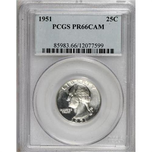 <B>1951 25C PR66 Cameo PCGS.</B></I> Deeply reflective with distinct contrast between the minimally toned fields and the moderately frosted devices. An attractive example of this early modern proof issue. Population: 43 in 66 Cameo, 39 finer (10/07).<BR><BR><b>Shipping:</b> Coins & Currency (<a target="_blank" href="http://www.heritageauctions.com/common/shipping.php">view shipping information</a>)