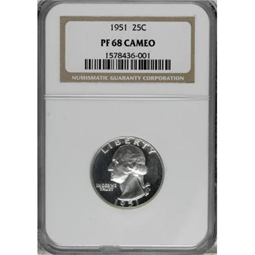 <B>1951 25C PR68 Cameo NGC.</B></I> A well-cameoed example with strong black and white contrast that is undiminished by the presence of any toning. Heavy die polish on the devices is not to be confused with hairline scratches, as this quarter is pristine. Census: 20 in 68 Cameo, 0 finer (12/07).<BR><BR><b>Shipping:</b> Coins & Currency (<a target="_blank" href="http://www.heritageauctions.com/common/shipping.php">view shipping information</a>)