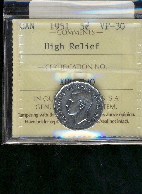 1951 5¢ High Relief ICCS VF30.