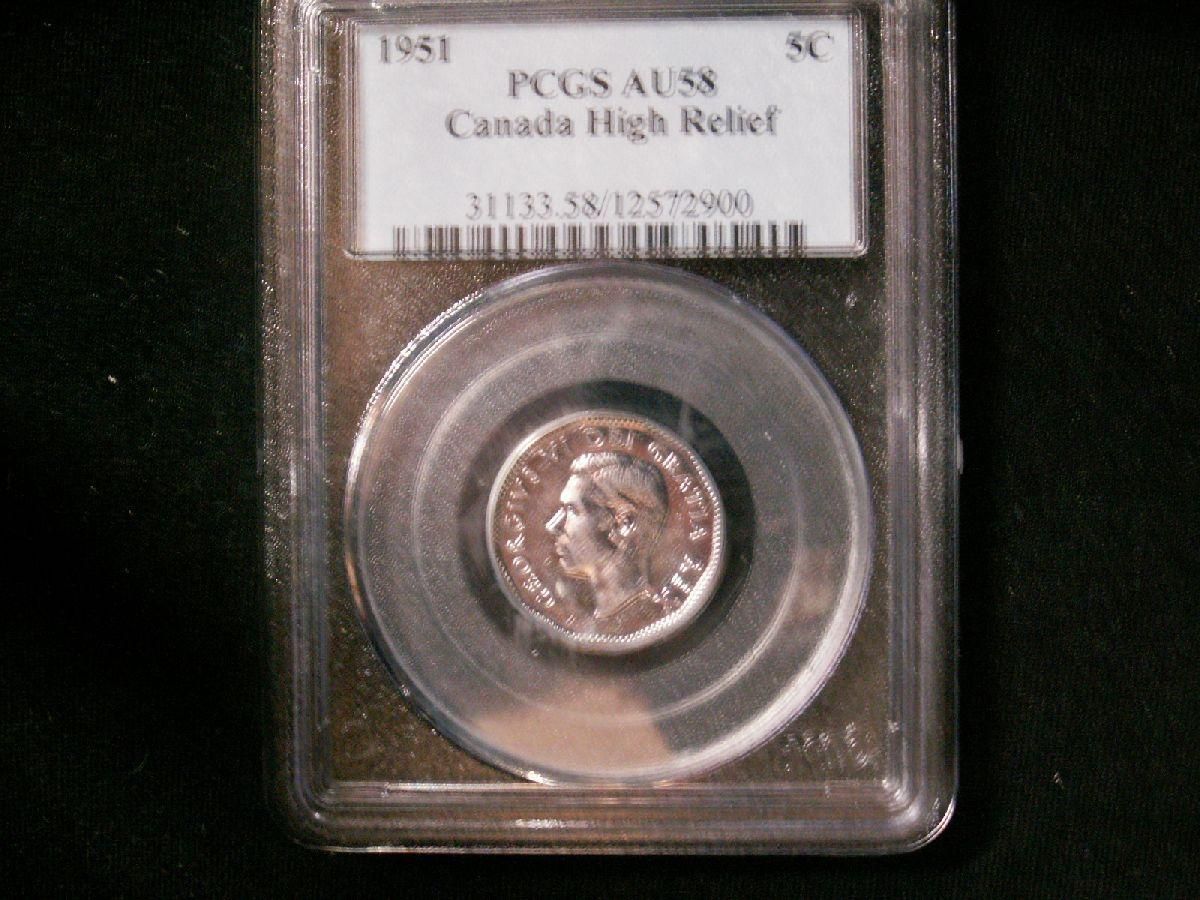 1951 5¢ High Relief PCGS AU58. Lots of lustre. Scarce.