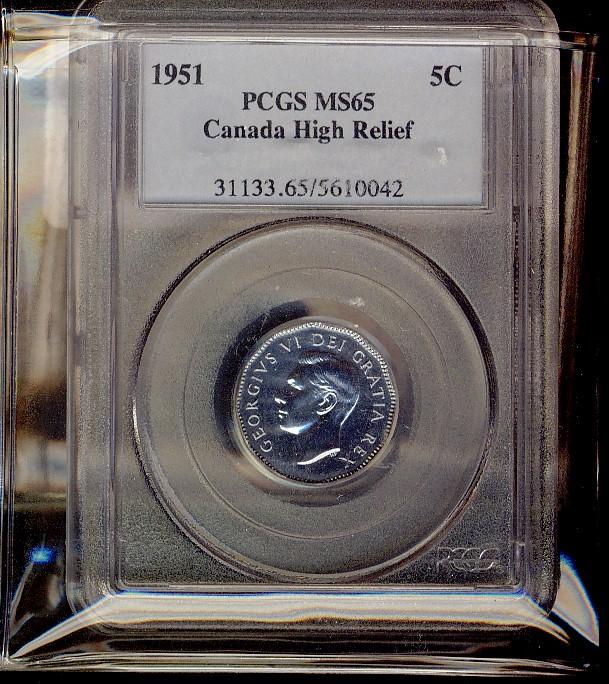1951 5¢ High Relief PCGS MS-65 Brilliant with full luster. Excellent strike with clean fields and nice mirror surfaces.
