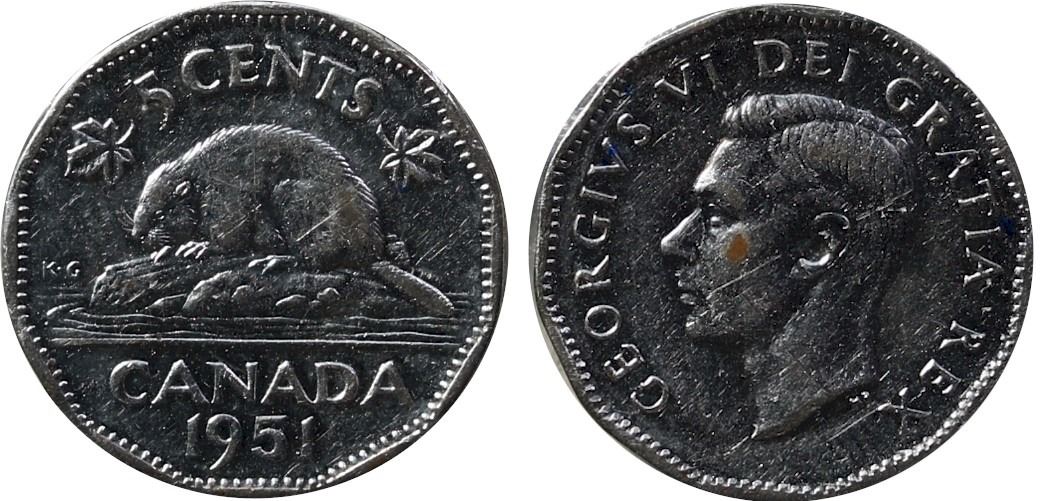1951 5¢ "High Relief" VF-EF usual meter scratch. Sought-after variety.