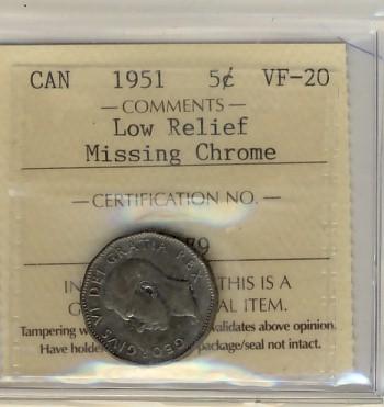 1951 5¢ Low Relief Missing Chrome ICCS VF20.