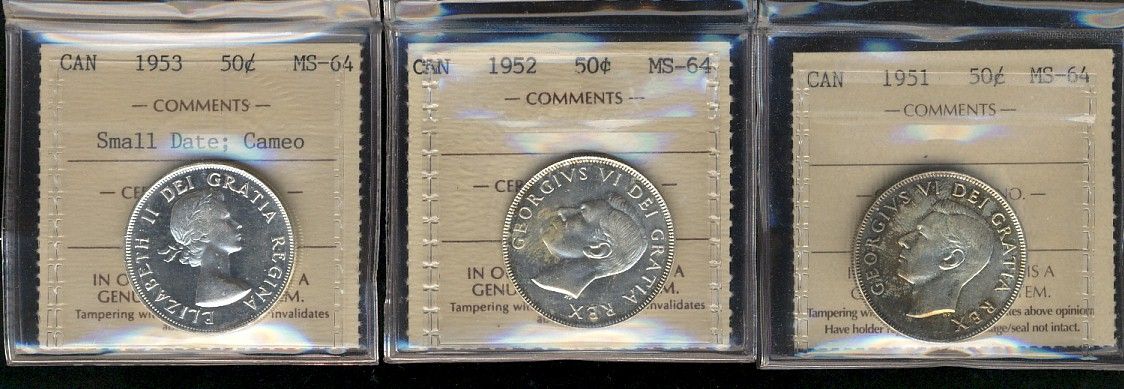 1951 50¢, 1952 & 1953 SD Cameo all ICCS MS64. Lot of 3 coins.