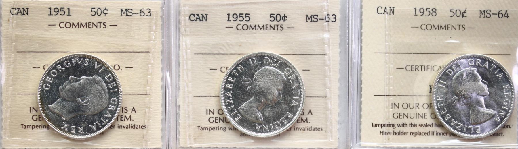 1951 50¢, 1955 & 1958 ICCS Choice Mint State-63 to Choice Mint State-64. Lot of 3 coins.