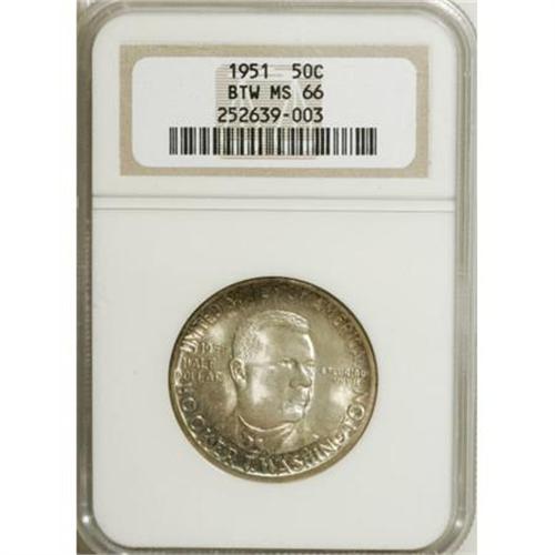 <B>1951 50C Booker T. Washington MS66 NGC.</B></I> NGC Census: (77/8). PCGS Population (110/3). Mintage: 510,082. Numismedia Wsl. Price for NGC/PCGS coin in MS66: $392. (#9424)<BR><BR><b>Shipping:</b> Coins & Currency (<a target="_blank" href="http://www.heritageauctions.com/common/shipping.php">view shipping information</a>)