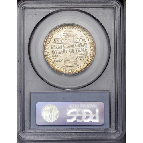 <B>1951 50C Booker T. Washington MS66 PCGS.</B></I> Flashy luster enlivens the pastel sky-blue, golden-brown, and lavender surfaces, and a thin toning streak travels across the lower-middle obverse. A sharp strike complements the well preserved surfaces; a couple of trivial obverse marks do not detract from the overall eye appeal of this stunning coin.