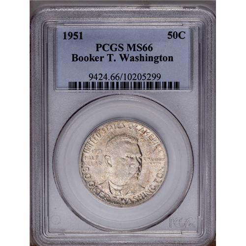 <B>1951<50C> Booker T. Washington MS66 PCGS.</B></I> Original medium golden-brown patination endows this lustrous and refreshingly clean Premium Gem. The strike is decidedly above average, although the portrait lacks absolute detail.