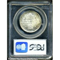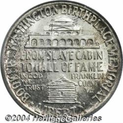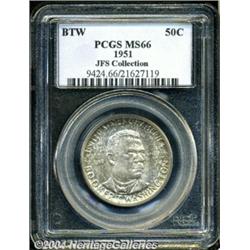 <B>1951<50C> Booker T. Washington MS66 PCGS.</B></I> Mottled charcoal-russet patina is seen over each side of this obviously lustrous Gem. Well struck throughout, it is hard to locate even a tiny mark under close examination. Certainly a worthwhile addition for any high grade collection. Population: 58 in 66, 2 finer (3/04).<BR><I>From the JFS Collection, the #1 All-Time PCGS Registry Set.</B></I> <BR><BR><B>Important notice:</B> Heritage usually auctions material at the rate of 200-250 lots per hour. On some occasions eBay Live bid software or the Internet may not be able to keep up with the pace of the auction. We recommend placing a realistic absentee bid now as insurance to avoid disappointment. Occasionally the auctioneer may eliminate or reject an eBay Live bid, and the auctioneer may also reopen a lot after the close of the eBay live bidding (usually because we missed an audience bid), and may reject your bid even if it shows you as the winning bidder. By bidding via eBay Live, you agree that Heritage may award the lot to another bidder at its sole discretion under the circumstances described above or any other reasonable circumstances. Since eBay bids are not shown to us until we open the lot on the floor, we treat those bids just like floor bids. In most cases the floor responds before the eBay bid is presented to us, due to Internet lag time, so for consistency we have made it a policy that floor bids are always considered first over tie eBay live bids. Also please note that all Heritage lots purchased through eBay Live carry a 20% Buyer's Premium. Please make sure you read the Terms and Conditions before you bid. </span></font></tr></table></td></tr></table>