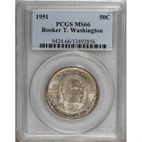 <B>1951 50C Booker T. Washington MS66 PCGS.</B></I> PCGS Population (116/4). NGC Census: (79/8). Mintage: 510,082. Numismedia Wsl. Price for NGC/PCGS coin in MS66: $392. (#9424)<BR><BR><b>Shipping:</b> Coins & Currency (<a target="_blank" href="http://www.heritageauctions.com/common/shipping.php">view shipping information</a>)