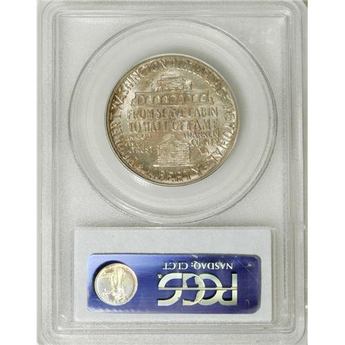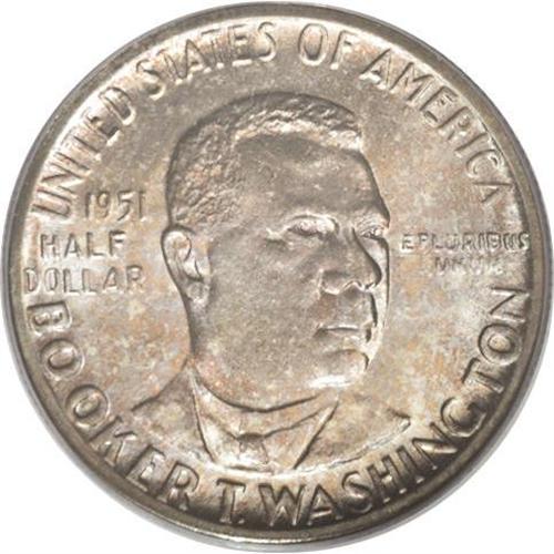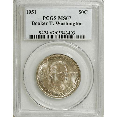 <B>1951 50C Booker T. Washington MS67 PCGS.</B></I> This series and the Carver-Washington half dollar series rounded out the classic commemorative series, bringing the total of silver varieties to 144 coins. Few Superb quality examples of these two subsets exist today, as the quality was generally not that high when the coins were struck. This piece has frosty luster beneath impressive gold, lilac, and iridescent toning. It is nearly perfect, and has never been exceeded by any examples certified by PCGS. Population: 3 in 67, 0 finer (3/07).<BR><BR><b>Shipping:</b> Coins & Currency (<a target="_blank" href="http://www.heritageauctions.com/common/shipping.php">view shipping information</a>)