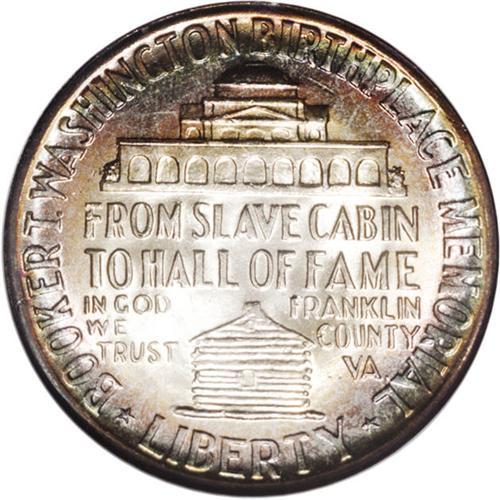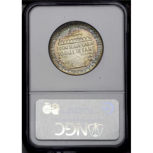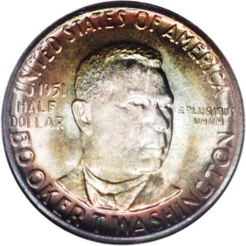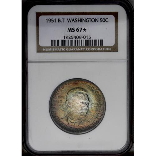 <B>1951<50C> Booker T. Washington MS67 <img border='0' src='http://www.heritagecoins.com/images/star.gif' width=10 height=10> NGC.</B></I> Rich multicolored patina blankets both sides of this Superb Gem, which is boldly struck and very pristine. For those who appreciate deep toning, this coin will possess a high degree of eye appeal indeed. One milling mark is noted on Washington's cheek. Census: 2 in 67, none finer (3/06). <BR><BR><B>Important notice:</B> Heritage usually auctions material at the rate of 200-250 lots per hour. On some occasions eBay Live bid software or the Internet may not be able to keep up with the pace of the auction. We recommend placing a realistic absentee bid now as insurance to avoid disappointment. Occasionally the auctioneer may eliminate or reject an eBay Live bid, and the auctioneer may also reopen a lot after the close of the eBay live bidding (usually because we missed an audience bid), and may reject your bid even if it shows you as the winning bidder. By bidding via eBay Live, you agree that Heritage may award the lot to another bidder at its sole discretion under the circumstances described above or any other reasonable circumstances. Since eBay bids are not shown to us until we open the lot on the floor, we treat those bids just like floor bids. In most cases the floor responds before the eBay bid is presented to us, due to Internet lag time, so for consistency we have made it a policy that floor bids are always considered first over tie eBay live bids. Also please note that all Heritage lots purchased through eBay Live carry a 20% Buyer's Premium. Please make sure you read the Terms and Conditions before you bid. This lot is being auctioned in conjunction with a live floor auction by Heritage Galleries & Auctioneers. All final auction and invoice information will be supplied by Heritage Galleries & Auctioneers, and all other information should be considered preliminary. Lot:5125 <BR><BR><B>Winning Notification and Billing:</B> After the FINAL session in this auction is complete, Heritage will send e-mail and snail mail invoices. This process normally takes several days. All final auction and invoice information will be supplied by Heritage Galleries & Auctioneers, and all other information should be considered preliminary. <BR><BR>This auction will be conducted on a live auction floor and over the Internet through eBay Live. If you choose to place an absentee bid, please take a moment to <font color='#0000ff'><u><a href='http://pages.ebay.com/liveauctions/help/before/laabsentee.html'>learn how eBay Live absentee bidding works</a></u></font><font color='#000000'>