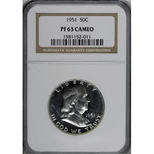 <B>1951 50C PR63 Cameo NGC.</B></I> NGC Census: (34/358). PCGS Population (18/205). Numismedia Wsl. Price for NGC/PCGS coin in PR63: $300. (#86692)<BR><BR><b>Shipping:</b> Coins & Currency (<a target="_blank" href="http://www.heritageauctions.com/common/shipping.php">view shipping information</a>)