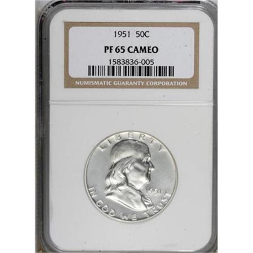<B>1951 50C PR65 Cameo NGC.</B></I> An enticing and immensely reflective example of this earlier Franklin proof, shining and minimally toned with solid contrast. A small circular depression behind the portrait appears to be a minor planchet flaw.<BR><BR><b>Shipping:</b> Coins & Currency (<a target="_blank" href="http://www.heritageauctions.com/common/shipping.php">view shipping information</a>)