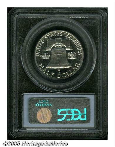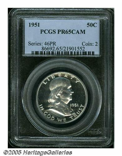 <B>1951<50C> PR65 Cameo PCGS.</B></I> Brilliant surfaces display whispers of speckled milky color under magnification, and the design elements are exquisitely struck. A minute mark on Franklin's cheek is mentioned for accuracy.