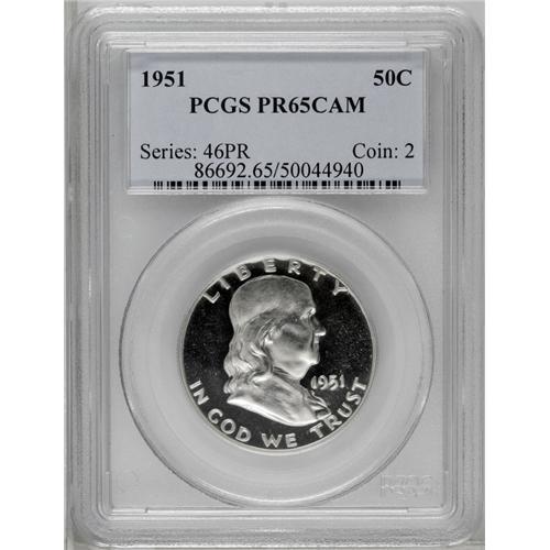 <B>1951<50C> PR65 Cameo PCGS.</B></I> Impressive frost blankets the devices and legends, and provides exemplary contrast with the darkly reflective fields. A splendid Gem, meritorious of a high quality proof Franklin set. <BR><BR><B>Important notice:</B> Heritage usually auctions material at the rate of 200-250 lots per hour. On some occasions eBay Live bid software or the Internet may not be able to keep up with the pace of the auction. We recommend placing a realistic absentee bid now as insurance to avoid disappointment. Occasionally the auctioneer may eliminate or reject an eBay Live bid, and the auctioneer may also reopen a lot after the close of the eBay live bidding (usually because we missed an audience bid), and may reject your bid even if it shows you as the winning bidder. By bidding via eBay Live, you agree that Heritage may award the lot to another bidder at its sole discretion under the circumstances described above or any other reasonable circumstances. Since eBay bids are not shown to us until we open the lot on the floor, we treat those bids just like floor bids. In most cases the floor responds before the eBay bid is presented to us, due to Internet lag time, so for consistency we have made it a policy that floor bids are always considered first over tie eBay live bids. Also please note that all Heritage lots purchased through eBay Live carry a 20% Buyer's Premium. Please make sure you read the Terms and Conditions before you bid. This lot is being auctioned in conjunction with a live floor auction by Heritage Galleries & Auctioneers. All final auction and invoice information will be supplied by Heritage Galleries & Auctioneers, and all other information should be considered preliminary. Lot:3144 <BR><BR><B>Winning Notification and Billing:</B> After the FINAL session in this auction is complete, Heritage will send e-mail and snail mail invoices. This process normally takes several days. All final auction and invoice information will be supplied by Heritage Galleries & Auctioneers, and all other information should be considered preliminary. <BR><BR>This auction will be conducted on a live auction floor and over the Internet through eBay Live. If you choose to place an absentee bid, please take a moment to <font color='#0000ff'><u><a href='http://pages.ebay.com/liveauctions/help/before/laabsentee.html'>learn how eBay Live absentee bidding works</a></u></font><font color='#000000'>