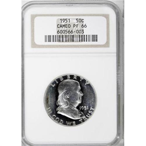 <B>1951 50C PR66 Cameo NGC.</B></I> Light but distinct contrast is evident on each side of this Premium Gem. The fields are minimally toned save for a touch of russet at the left obverse rim, and the devices offer delicate frost. NGC has graded 13 finer Cameo coins (12/07).<BR><BR><b>Shipping:</b> Coins & Currency (<a target="_blank" href="http://www.heritageauctions.com/common/shipping.php">view shipping information</a>)