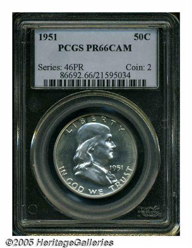 <B>1951<50C> PR66 Cameo PCGS.</B></I> Whispers of champagne color show on the obverse borders, and the fields reveal faint speckled milky color. The surfaces are virtually unimpaired. Population: 46 in 66 Cameo, 5 finer (6/05).