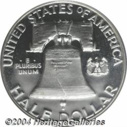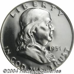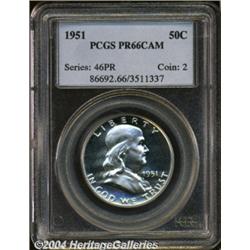 <B>1951<50C> PR66 Cameo PCGS.</B></I> The 1951 is a relatively scarce Franklin to obtain in full cameo. Frosty devices and mirrored fields give this half the sought after black-and-white look. One small contact mark is seen above Franklin's ear near the center of the obverse.<BR><I>From the JFS Collection.</B></I> <BR><BR><B>Important notice:</B> Heritage usually auctions material at the rate of 200-250 lots per hour. On some occasions eBay Live bid software or the Internet may not be able to keep up with the pace of the auction. We recommend placing a realistic absentee bid now as insurance to avoid disappointment. Occasionally the auctioneer may eliminate or reject an eBay Live bid, and the auctioneer may also reopen a lot after the close of the eBay live bidding (usually because we missed an audience bid), and may reject your bid even if it shows you as the winning bidder. By bidding via eBay Live, you agree that Heritage may award the lot to another bidder at its sole discretion under the circumstances described above or any other reasonable circumstances. Since eBay bids are not shown to us until we open the lot on the floor, we treat those bids just like floor bids. In most cases the floor responds before the eBay bid is presented to us, due to Internet lag time, so for consistency we have made it a policy that floor bids are always considered first over tie eBay live bids. Also please note that all Heritage lots purchased through eBay Live carry a 20% Buyer's Premium. Please make sure you read the Terms and Conditions before you bid. </span></font></tr></table></td></tr></table>