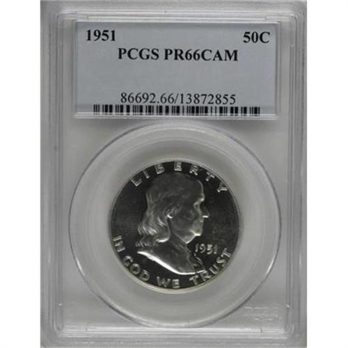 <B>1951 50C PR66 Cameo PCGS.</B></I> Fully struck with amazingly crisp detail on the Liberty Bell, including the lettering. This piece is well preserved and free of bothersome hairlines or contact marks. A trace of haze in the fields prevents an even loftier grade. Population: 51 in 66 Cameo, 6 finer (10/07). <BR><BR><b>Shipping:</b> Coins & Currency (<a target="_blank" href="http://www.heritageauctions.com/common/shipping.php">view shipping information</a>)