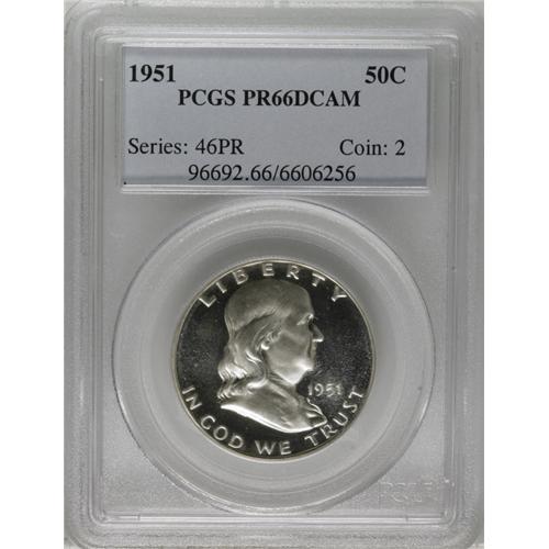 <B>1951 50C PR66 Deep Cameo PCGS.</B></I> The halves of the early 1950s represent some of the most difficult proof issues to acquire with such heavy contrast. This boldly impressed and untoned beauty is one such piece, deeply mirrored with heavy frost on the devices. An excellent opportunity for the dedicated collector. Population: 11 in 66 Deep Cameo, 1 finer (11/06).<BR><BR><b>Shipping:</b> Coin/Currency (<a target="_blank" href="http://www.heritageauctions.com/common/shipping.php">view shipping information</a>)