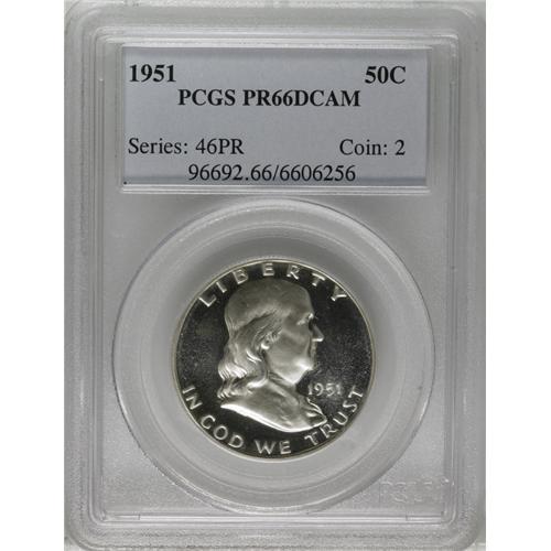 <B>1951 50C PR66 Deep Cameo PCGS.</B></I> The halves of the early 1950s represent some of the most difficult proof issues to acquire with heavy contrast. This boldly impressed and untoned beauty is one such piece, deeply mirrored with heavy frost on the devices. An excellent opportunity for the dedicated collector. Population: 11 in 66 Deep Cameo, 1 finer (3/07).<BR><BR><b>Shipping:</b> Coin/Currency (<a target="_blank" href="http://www.heritageauctions.com/common/shipping.php">view shipping information</a>)
