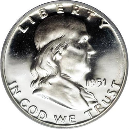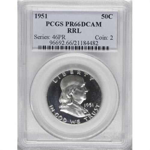 <B>1951 50C PR66 Deep Cameo PCGS. CAC.</B></I> Ex: RRL. The 1951 has a proof mintage of 57,500 pieces, less than 2% of the production of the series-ending 1961 through 1963 proof issues. Deep Cameo examples comprise only a fraction of the 1951 proofs, since only the first pieces struck by freshly installed dies exhibited white-on-black distinction. This high grade example has frosty motifs and light peripheral russet patina. Population: 11 in 66 Deep Cameo, 1 finer (11/07).<BR><I>From The Kallenberg #1 PCGS Registry Set Of Proof Half Dollars.</B></I><BR><BR><b>Shipping:</b> Coins & Currency (<a target="_blank" href="http://www.heritageauctions.com/common/shipping.php">view shipping information</a>)