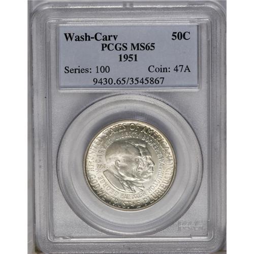 <B>1951<50C> Washington-Carver MS65 PCGS.</B></I> This is a brilliant Gem, and it is scarce in this state. Only 20 finer examples of this issue have been certified by PCGS. A complete set of this design consists of 12 coins, and eight of those 12 had mintages between 8,003 and 12,006 coins. This date is one of the other four, with a production of 110,018 coins.