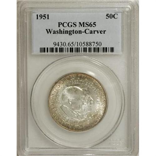 <B>1951 50C Washington-Carver MS65 PCGS.</B></I> PCGS Population (130/26). NGC Census: (184/18). Mintage: 110,018. Numismedia Wsl. Price for NGC/PCGS coin in MS65: $252. (#9430)<BR><BR><b>Shipping:</b> Coins & Currency (<a target="_blank" href="http://www.heritageauctions.com/common/shipping.php">view shipping information</a>)