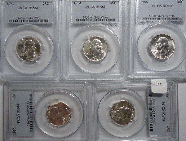 1951, 54, 55, 57, & 58 WASHINGTON QUARTERS ALL PCGS MS-64