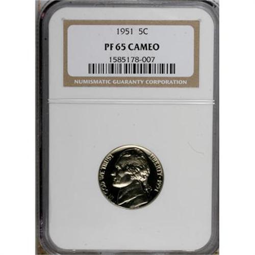 <B>1951 5C PR65 Cameo NGC.</B></I> NGC Census: (82/567). PCGS Population (212/777). Mintage: 57,500. Numismedia Wsl. Price for NGC/PCGS coin in PR65: $48. (#4183)<BR><BR><B>Coin Engraver:</B> Felix Schlag<BR><BR><b>Shipping:</b> Coins & Currency (<a target="_blank" href="http://www.heritageauctions.com/common/shipping.php">view shipping information</a>)
