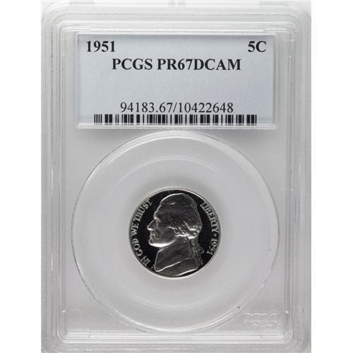<B>1951 5C PR67 Deep Cameo PCGS.</B></I> A fabulous specimen with crystal clear design elements and immense contrast between the frosted devices and deeply watery fields. From a proof mintage of 57,500 pieces, of which a mere 13 coins have been assigned the Deep Cameo (or Ultra Cameo) designation, from NGC and PCGS (12/06).<BR><BR><b>Shipping:</b> Coin/Currency (<a target="_blank" href="http://www.heritageauctions.com/common/shipping.php">view shipping information</a>)