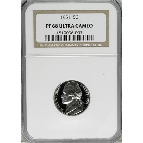 <B>1951 5C PR68 Ultra Cameo NGC.</B></I> This is one of the most amazing proof examples of the date that we have ever handled. Both sides have brilliant light gray color with "white-on-black" contrast. The fields are exceptionally deep and the devices are highly lustrous. Census: 1 in 68 Ultra Cameo, 1 finer (4/07).<BR><BR><b>Shipping:</b> Coins & Currency (<a target="_blank" href="http://www.heritageauctions.com/common/shipping.php">view shipping information</a>)