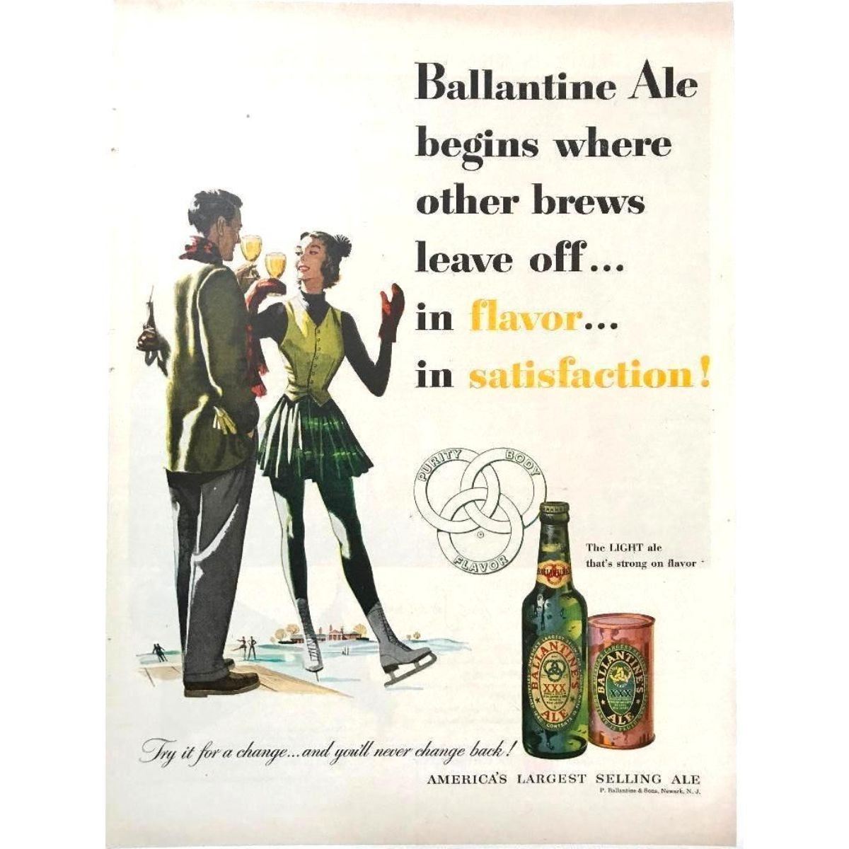 Original Mid-century 1951 magazine advertisement for Ballantine Ale, features an illustrated couple, ice skating & enjoying glasses of beer. 10" X 14" mounted on archival linen canvas for preservation.