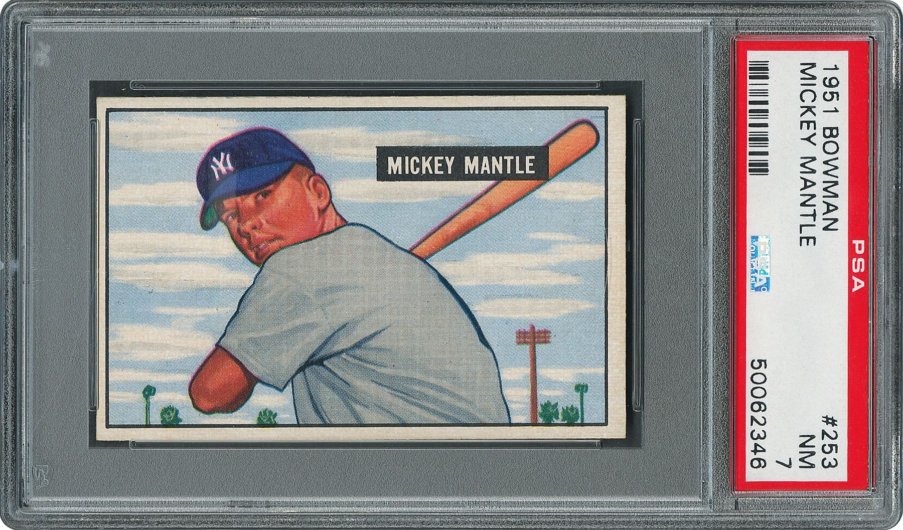 Graded by PSA NM 7. Mickey Mantle is still considered by many to be the last true baseball hero. The young outfielder accepted the torch passed by the great Joe DiMaggio, who had similarly followed in the path of Lou Gehrig. The 1951 season was Mantle's first in pinstripes and, despite his being sent back down to the minors for more seasoning, Bowman issued this card in that year's final, key series. Bowman's initial vision of future greatness is wonderfully captured on this mini-artwork, rendered as a horizontal image set against the brightest of skies. As with the more well known 1952 Topps issue, this 1951 Bowman card is the first card of the more difficult high number series. For many years, the 1951 Bowman lagged behind the 1952 Topps Mantle is both desirability and value, but over the last 10 years as more people realize how difficult the 1951 Bowman is compared to its larger cousin, these factors have changed. The 1951 Bowman Mantle rookie card is now one of the more desirable cards in the market right now, and the prices realized numbers bear this out. Two years ago, this card was regularly selling from $20,000 to $24,000, whereas the last few examples have surpassed $30,000, with two of the last three examples in and around $35,000. This example of Mickey Mantle's rookie card will eliminate the need to upgrade a top-quality collection for most collectors. Only in the most carefully preserved specimens, as the offered example does the design's true magnificence reveal itself. This example has superb creamy-white borders culminating in four sharp corners. It has a clean surface, though it is centered a bit towards the top. The card has tremendous visual appeal with bold colors and a full, uninterrupted image. It has escaped the printing inconsistencies that characterize the issue and which make "clear" examples, like this one, so very special. The reverse is perfectly centered and unblemished. Solid Near Mint condition with strong investment potential.