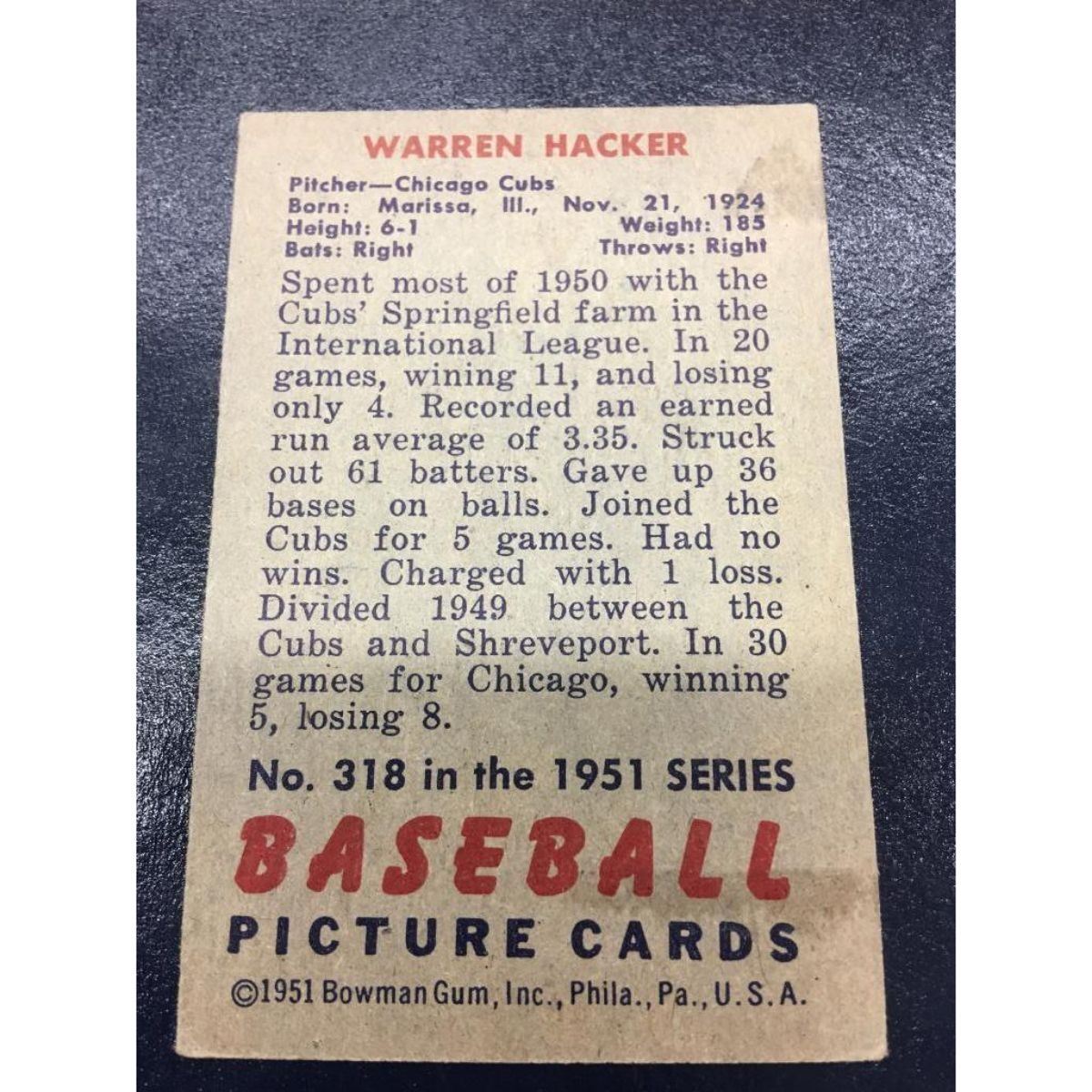 A 1951 Bowman #318 Warren Hacker RC Rookie Baseball Card. A Great Rookie Card To Add To Any Baseball Card Collection. View Photos For Further Details. Â