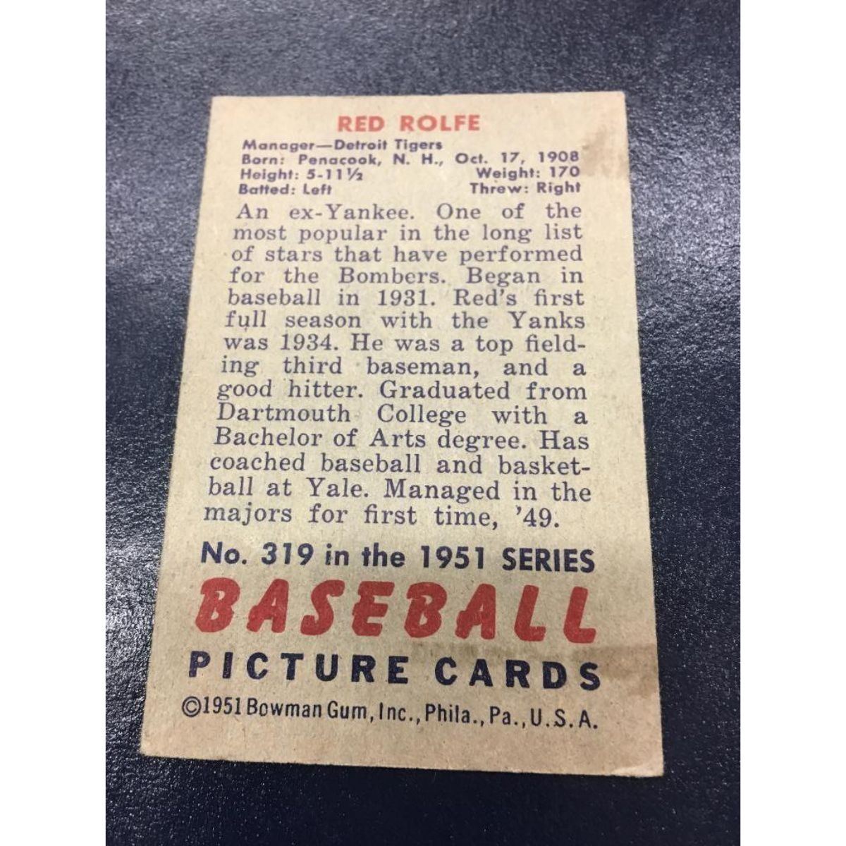 A 1951 Bowman Baseball #319 RED ROLFE -Manager Baseball Card (Detroit Tigers). A High Number Card That Is A Rare Find In This Set. View Photos For Further Details.