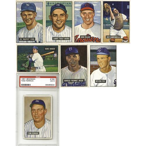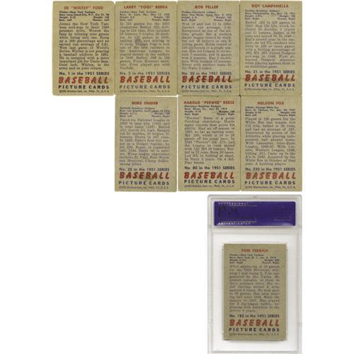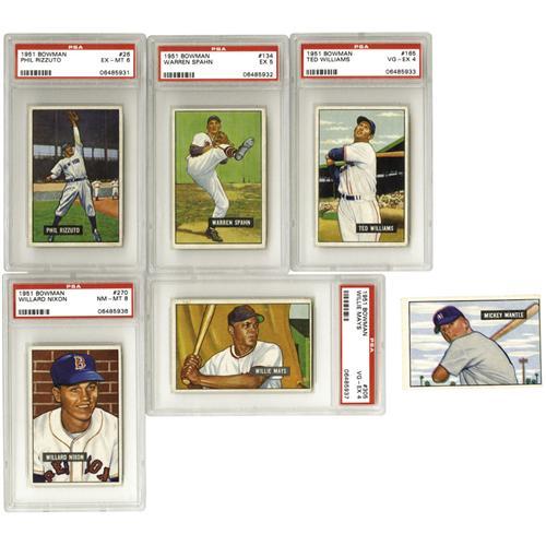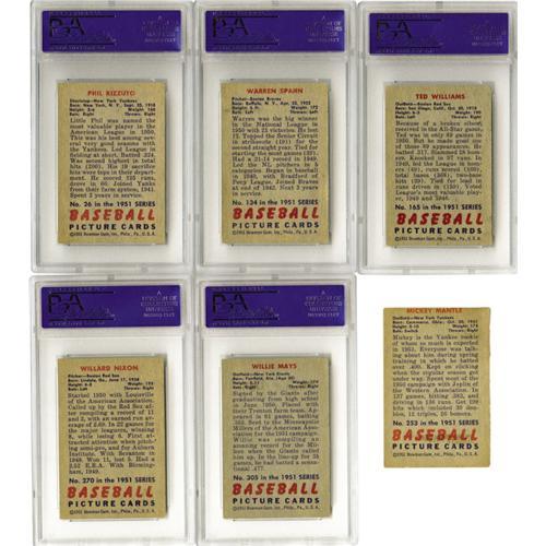 <B>1951 Bowman Baseball Complete Set (324).</B></I> The 1951 Bowman cards, like those from 1950, are color art reproductions of actual photographs. Each card measures 2-1/16" x 3-1/8" in size. A total of six cards have been graded by PSA with an aggregate SMR value of $1205. Graded cards - <B>PSA 8:</B></I> #270; <B>PSA 6:</B></I> #26 Rizzuto; <B>PSA 5:</B></I> #134 Spahn, 182; <B>PSA 4:</B></I> #165 Williams, 305 Mays. Ungraded cards include #1 Ford (F/G), 2 Berra (VG), 3 Roberts (VG), 7 Hodges (VG), 30 Feller (EX), 31 Campanella (VG), 32 Snider (EX/MT), 80 Reese (VG), 181 Stengel (EX), 186 Ashburn (EX), 198 Irvin (VG), 232 Fox (EX), 253 Mantle (PSA has indicated altered), 254 Jensen (EX/MT), 290 Dickey (VG). Set grades 35% EX to EX/MT, 55% VG to VG/EX, 10% FR to GD.