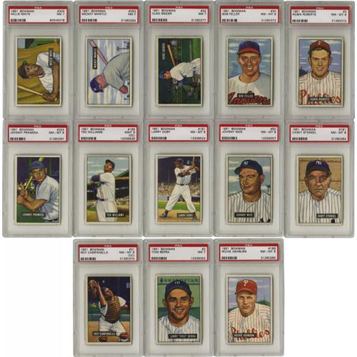 <B>1951 Bowman Baseball High-Grade Complete Set (324).</B></I> Offered here is a stunningly fresh complete set of the historic 1951 Bowman issue including the two high-number rookie cards of Mickey Mantle and Willie Mays. This issue also marks the first time that Bowman increased the size from the original smaller cards to the new 2 1/16" x 3 1/8" size. A total of 84 cards have been graded by PSA with an aggregate SMR value of $22,845. Includes: Graded Cards - <B>PSA MINT 9:</B></I> 1 Card w/ # 165 Williams (oc). <B>PSA NM-MT 8:</B></I> 71 Cards w/ #'s 3 Roberts, 19, 22, 30 Feller, 31 Campanella (oc), 37, 50 Mize, 56, 60, 62 Boudreau, 84, 87, 88, 92, 94, 102, 108, 110, 112, 113, 114, 115, 119, 123, 124, 128, 129, 130, 139, 140, 141, 151 Doby, 155, 158, 160, 163, 168, 169, 171, 181 Stengel, 182, 184, 186 Ashburn, 190, 194, 196, 198 Irvin, 199, 201, 208, 216, 220, 223, 227, 228, 230, 237, 240, 250, 257, 258, 259, 260 Erskine, 291 Henrich, 296, 307, 310, 312, 315, 323 Adcock, 324 Pramesa. <B>PSA NM 7:</B></I> 10 Cards w/ #'s 2 Berra, 15, 32 Snider, 46 Kell, 53 Lemon, 72, 73, 253 Mantle, 284, 305, Mays. <B>PSA EX-MT 6:</B></I> 1 card w/ #122 Garagiola. <B>PSA EX 5:</B></I> 2 cards w/ #1 Ford, 295 Lopez. <B>Ungraded Cards -</B></I> Highlights Include #'s 7 Hodges (EX/MT), 58 Slaughter (EX/MT), 80 Reese (VG/EX), 134 Spahn (EX/MT), 232 Fox (EX), 233 Durocher (EX/MT), 254 Jensen (EX/MT), Dickey (EX/MT). Grades 43% NM to NM-MT, 54% EX to EX-MT, 3% lesser. <BR><BR><B>Important notice:</B> Heritage usually auctions material at the rate of 200-250 lots per hour. On some occasions eBay Live bid software or the Internet may not be able to keep up with the pace of the auction. We recommend placing a realistic absentee bid now as insurance to avoid disappointment. Occasionally the auctioneer may eliminate or reject an eBay Live bid, and the auctioneer may also reopen a lot after the close of the eBay live bidding (usually because we missed an audience bid), and may reject your bid even if it shows you as the winning bidder. By bidding via eBay Live, you agree that Heritage may award the lot to another bidder at its sole discretion under the circumstances described above or any other reasonable circumstances. Since eBay bids are not shown to us until we open the lot on the floor, we treat those bids just like floor bids. In most cases the floor responds before the eBay bid is presented to us, due to Internet lag time, so for consistency we have made it a policy that floor bids are always considered first over tie eBay live bids. Also please note that all Heritage lots purchased through eBay Live carry a 22.5% Buyer's Premium. Please make sure you read the Terms and Conditions before you bid. This lot is being auctioned in conjunction with a live floor auction by Heritage Galleries & Auctioneers. All final auction and invoice information will be supplied by Heritage Galleries & Auctioneers, and all other information should be considered preliminary. Lot:19555 <BR><BR><B>Winning Notification and Billing:</B> After the FINAL session in this auction is complete, Heritage will send e-mail and snail mail invoices. This process normally takes several days. All final auction and invoice information will be supplied by Heritage Galleries & Auctioneers, and all other information should be considered preliminary. <BR><BR>This auction will be conducted on a live auction floor and over the Internet through eBay Live. If you choose to place an absentee bid, please take a moment to <font color='#0000ff'><u><a href='http://pages.ebay.com/liveauctions/help/before/laabsentee.html'>learn how eBay Live absentee bidding works</a></u></font><font color='#000000'>