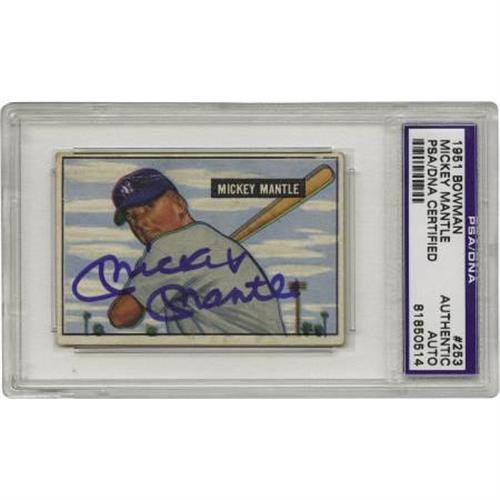 <B>1951 Bowman Mickey Mantle #253 Card, Signed.</B></I> The rookie card! The one that started it. One of his best cards for signing, however, not a popular one to have autographed while he was alive. Many collectors & dealers at the time believed that signing it would devalue the card. Not so now. Although the clarity is of issue here the overall VG/EX rating counts the rounded corners, back stain and slight crease across his cap. One can imagine seeing Mickey and Joe sharing the outfield in their only season together. Encapsulated by PSA/DNA for protection and unquestioned authenticity.<BR><BR><b>Shipping:</b> Sportscard (<a target="_blank" href="http://www.heritageauctions.com/common/shipping.php">view shipping information</a>)