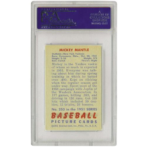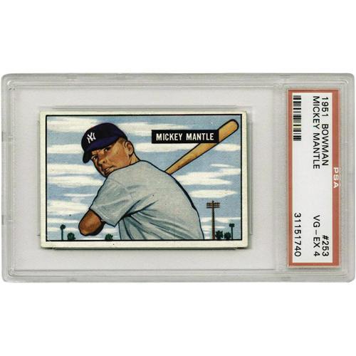 <B>1951 Bowman Mickey Mantle #253 PSA VG-EX 4.</B></I> The Mick's true rookie! While the 1952 Topps card is the one that gets all the ladies, you can't deny the appeal of this even earlier card, with the edge of the fateful number "6" visible on Mickey's back. The color and registration of the image area are that of a NM or better card, with light touches at the corners and a minor wax stain on verso all that brings this card down from the stratosphere. A solid team player of a card, just like the man himself. <BR><BR><B>Important notice:</B> Heritage usually auctions material at the rate of 200-250 lots per hour. On some occasions eBay Live bid software or the Internet may not be able to keep up with the pace of the auction. We recommend placing a realistic absentee bid now as insurance to avoid disappointment. Occasionally the auctioneer may eliminate or reject an eBay Live bid, and the auctioneer may also reopen a lot after the close of the eBay live bidding (usually because we missed an audience bid), and may reject your bid even if it shows you as the winning bidder. By bidding via eBay Live, you agree that Heritage may award the lot to another bidder at its sole discretion under the circumstances described above or any other reasonable circumstances. Since eBay bids are not shown to us until we open the lot on the floor, we treat those bids just like floor bids. In most cases the floor responds before the eBay bid is presented to us, due to Internet lag time, so for consistency we have made it a policy that floor bids are always considered first over tie eBay live bids. Also please note that all Heritage lots purchased through eBay Live carry a 22.5% Buyer's Premium. Please make sure you read the Terms and Conditions before you bid. This lot is being auctioned in conjunction with a live floor auction by Heritage Galleries & Auctioneers. All final auction and invoice information will be supplied by Heritage Galleries & Auctioneers, and all other information should be considered preliminary. Lot:19553 <BR><BR><B>Winning Notification and Billing:</B> After the FINAL session in this auction is complete, Heritage will send e-mail and snail mail invoices. This process normally takes several days. All final auction and invoice information will be supplied by Heritage Galleries & Auctioneers, and all other information should be considered preliminary. <BR><BR>This auction will be conducted on a live auction floor and over the Internet through eBay Live. If you choose to place an absentee bid, please take a moment to <font color='#0000ff'><u><a href='http://pages.ebay.com/liveauctions/help/before/laabsentee.html'>learn how eBay Live absentee bidding works</a></u></font><font color='#000000'>