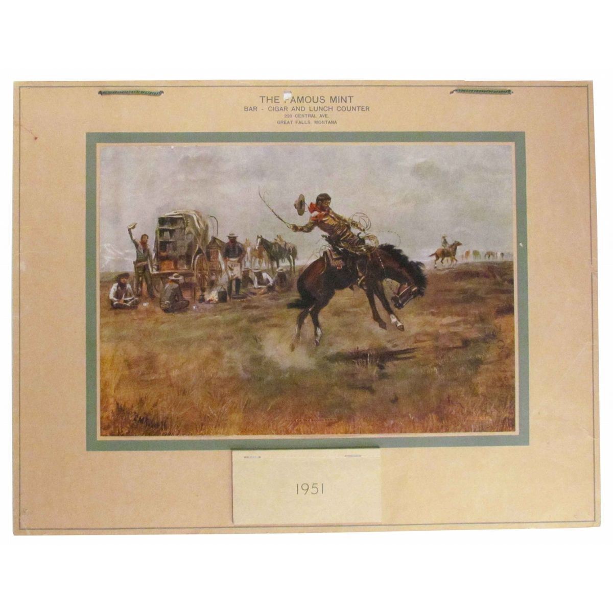 1951 Calendar for "The Famous Mint", Bar-Cigar and Lunch Counter. Great Falls, MT. Depicting Let-R-Buck image entitled, "Rider on the Rough String". A couple of creases and hole punched at 12:00 otherwise excellent condition. 19 X 14 1/2 inches. Start Price $40