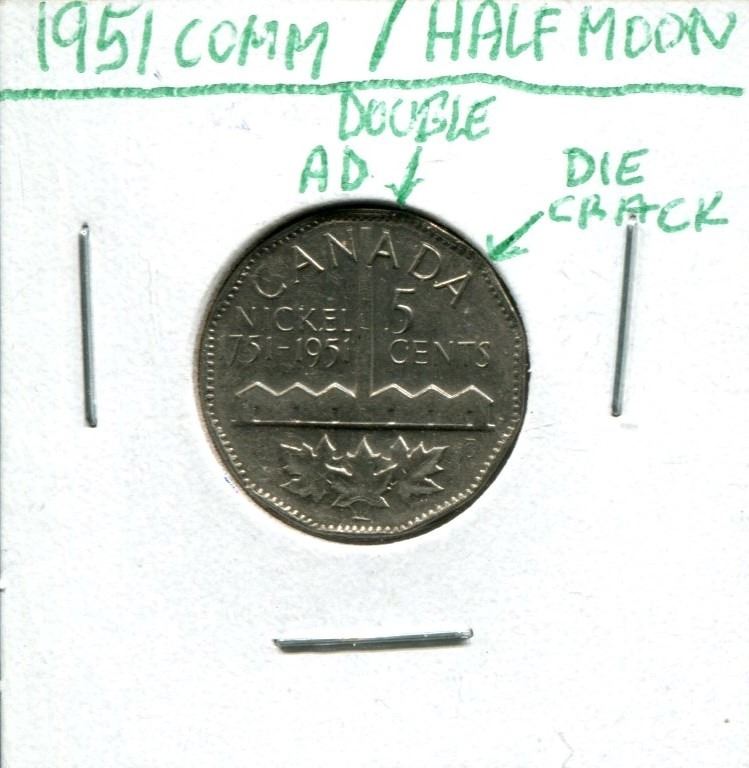 1951 Canadian 5 Cent Coin (Half Moon) (Double AD) (Die Crack) (Comm)