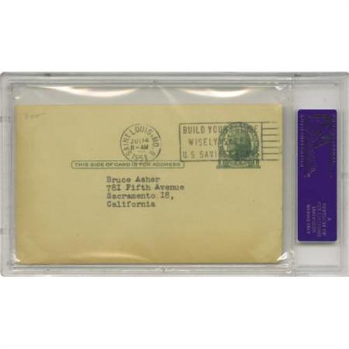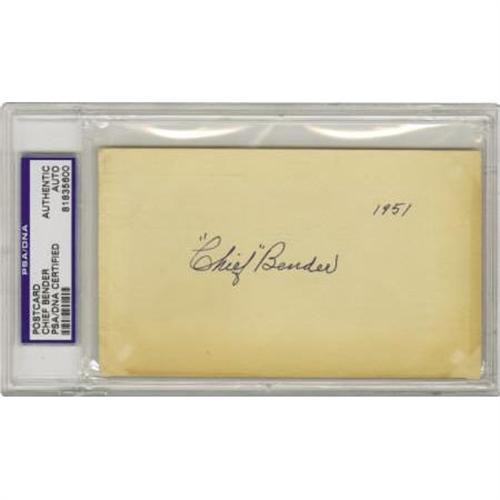 <B>1951 Charles Albert "Chief" Bender Signed Government Postcard.</B></I> A fellow Carlisle Indian School alumnus of the great Jim Thorpe, Charles Albert Bender provided the bulk of his Hall of Fame services to Connie Mack's Philadelphia Athletics, where he gained a well-deserved reputation as a clutch performer in the big game. Three years before his passing he graciously fulfilled a fan's autograph request with this penny postcard, adding the date of "1951" to his 10/10 black ink signature. Postmarked "St. Louis, MO., July 14, 1951," the postcard shows light, inconsequential toning. Encapsulated by PSA/DNA for protection and unquestioned authenticity.<BR><BR><b>Shipping:</b> Sportscard (<a target="_blank" href="http://www.heritageauctions.com/common/shipping.php">view shipping information</a>)